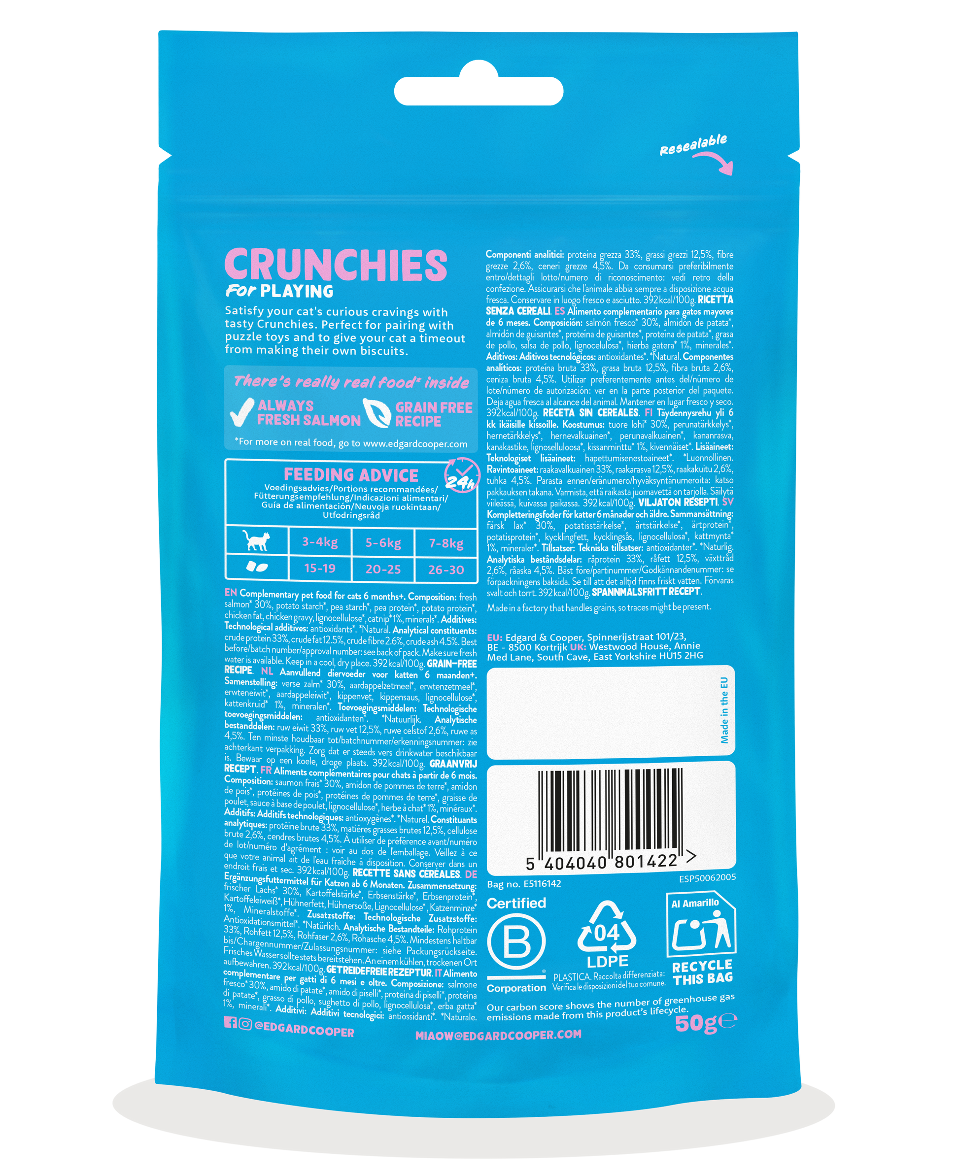 Hechos con sabroso salmón fresco e ingredientes naturales, sin azúcar ni cereales añadidos, estos premios vienen en una divertida variedad de formas que despertarán su curiosidad. Y con un toque de catnip (hierba gatera) harán que el juego sea aún más emocionante.