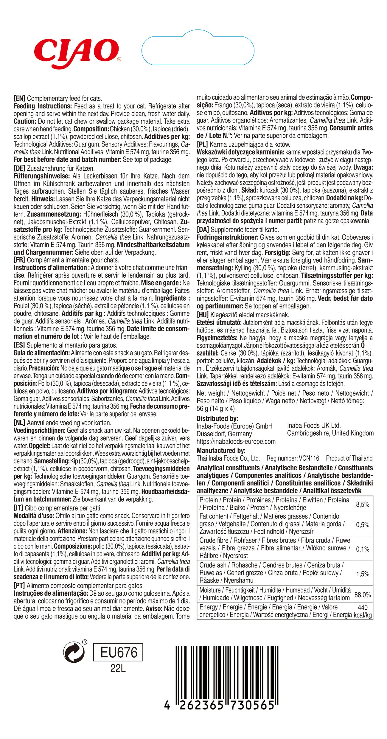 Pollo (30 %), tapioca desecada, extracto de vieira (1,1 %), celulosa en polvo, quitosano, goma guar, saborizantes, Camellia thea (té verde), vitamina E, taurina.