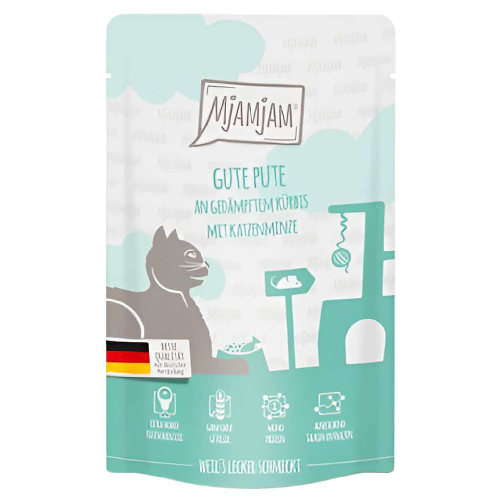 Ingredientes: Carne de pavo, corazón, hígado, molleja (68%), caldo de carne (28%), calabaza (2,9%), minerales (1%), menta para gatos (0,1%).