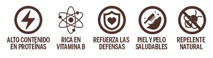 Contribuye al fortalecimiento y cuidado de piel, pelo y uñas. Fortalece el sistema inmune y actúa como antiparasitario natural.