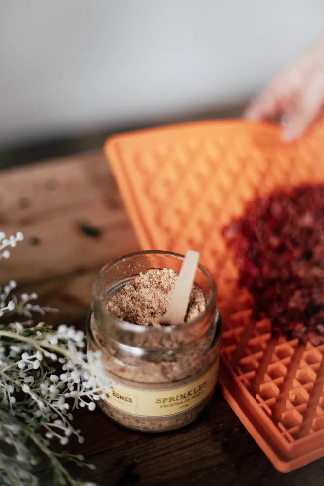 - Uso en alfombra olfativa: Espolvorea el topper en una alfombra tipo LickiMat® humedecida (con agua, kéfir o caldo) para estimular la curiosidad y el olfato.