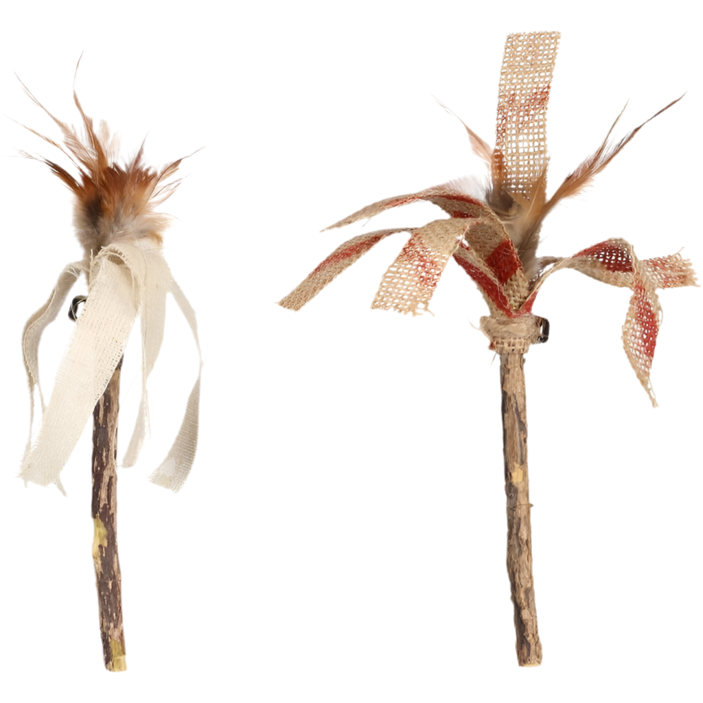 Un toque salvaje para tus felinos 🐱💨. Este juguete está hecho con madera natural y decorado con plumas y cintas de yute, pensado para despertar el instinto cazador de tu michi mientras se divierte y se relaja.