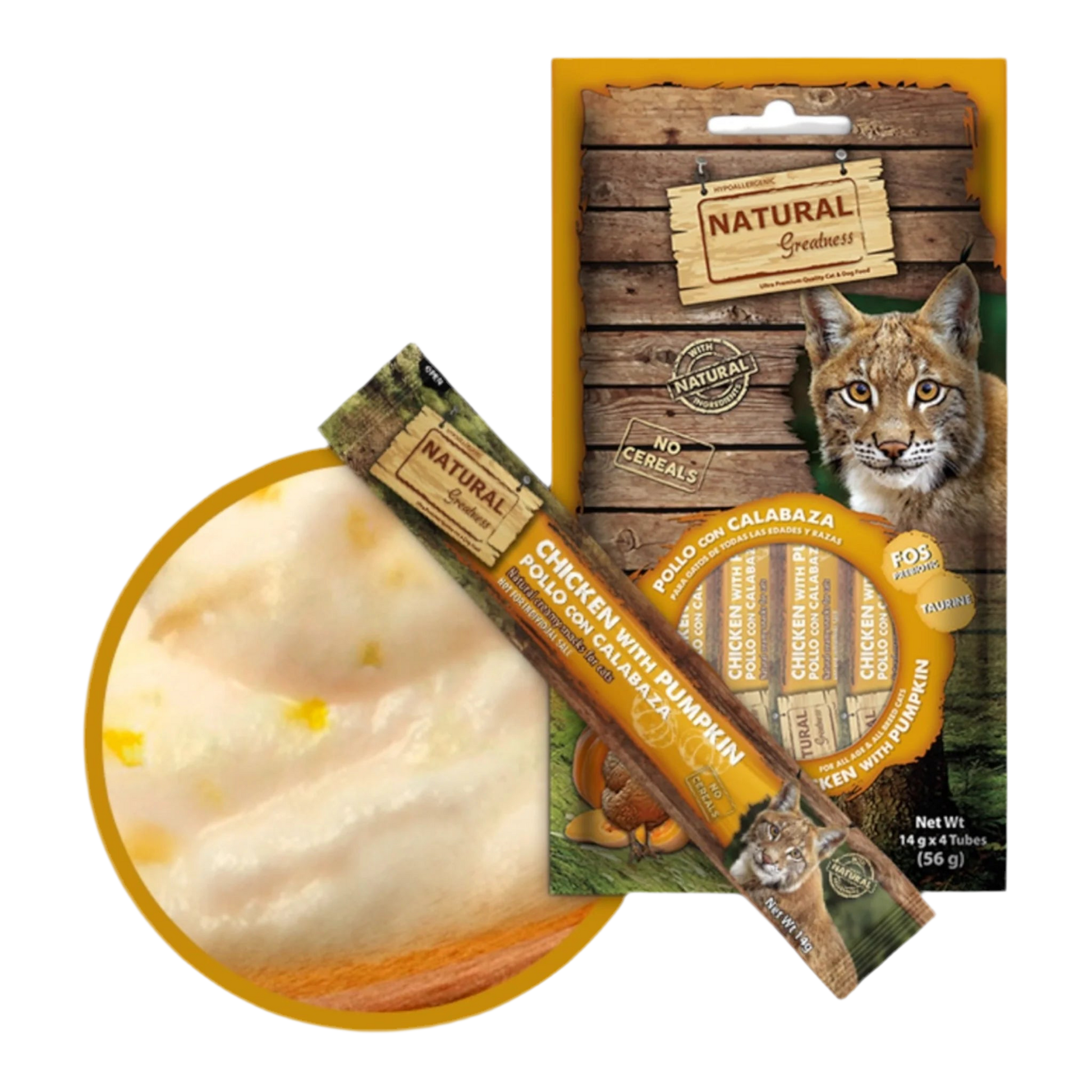 NATURAL GREATNESS POLLO CON CALABAZA es un suave snack cremoso hipoalergénico, elaborado sin cereales a partir de carne de pollo de primera calidad, ingredientes naturales como la calabaza y enriquecido con taurina y fructooligosacáridos, prebióticos muy beneficiosos para mantener una buena salud digestiva.