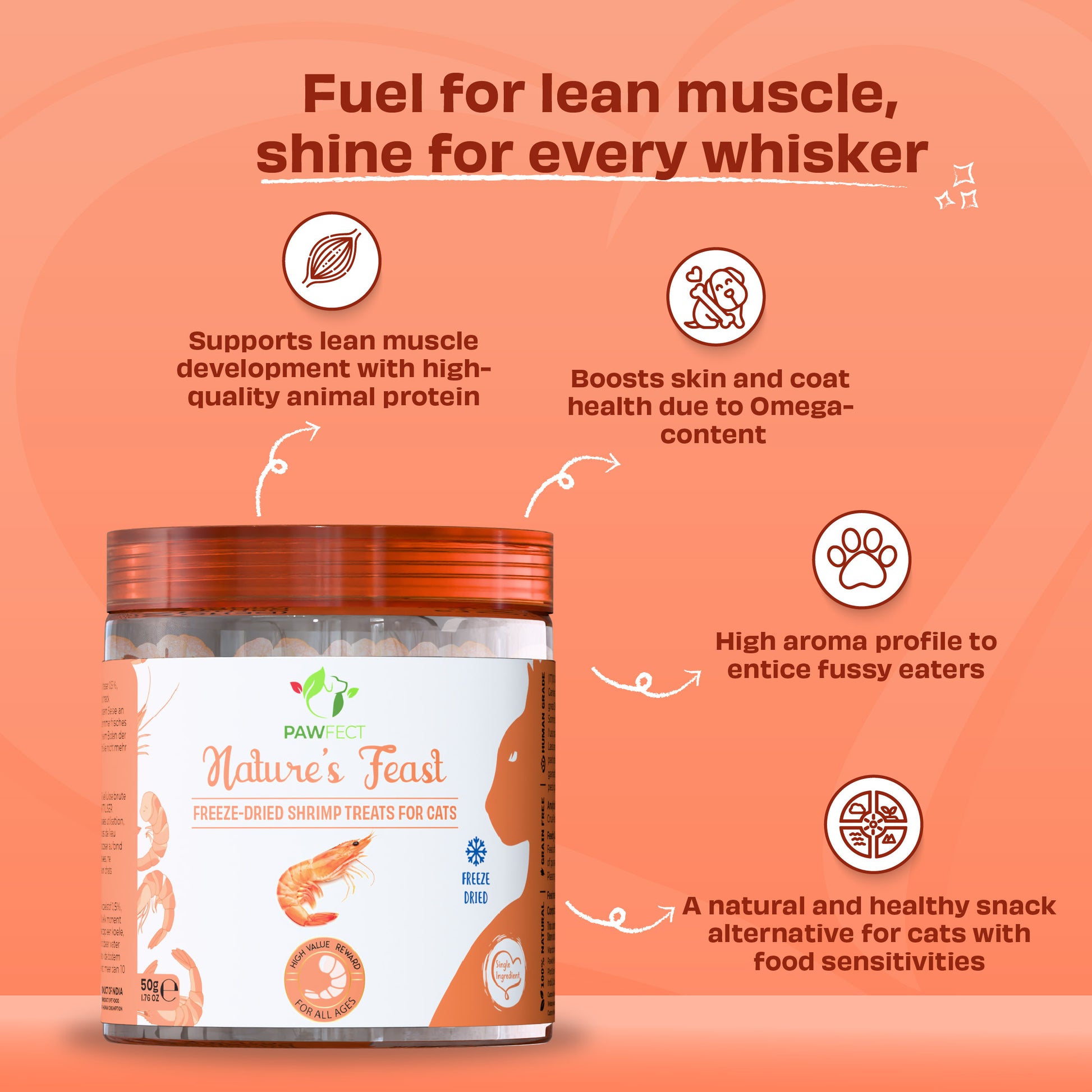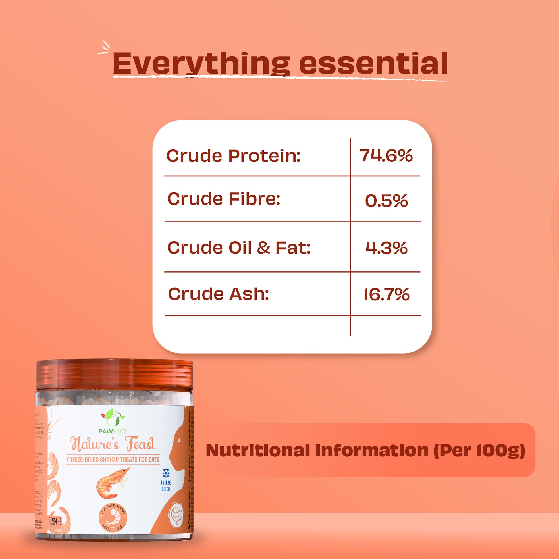 ✨ 100% naturales, con calidad de grado humano y sin aditivos, conservantes, cereales ni gluten. Solo gambas, liofilizadas cuidadosamente para mantener todo su valor nutricional y sabor.