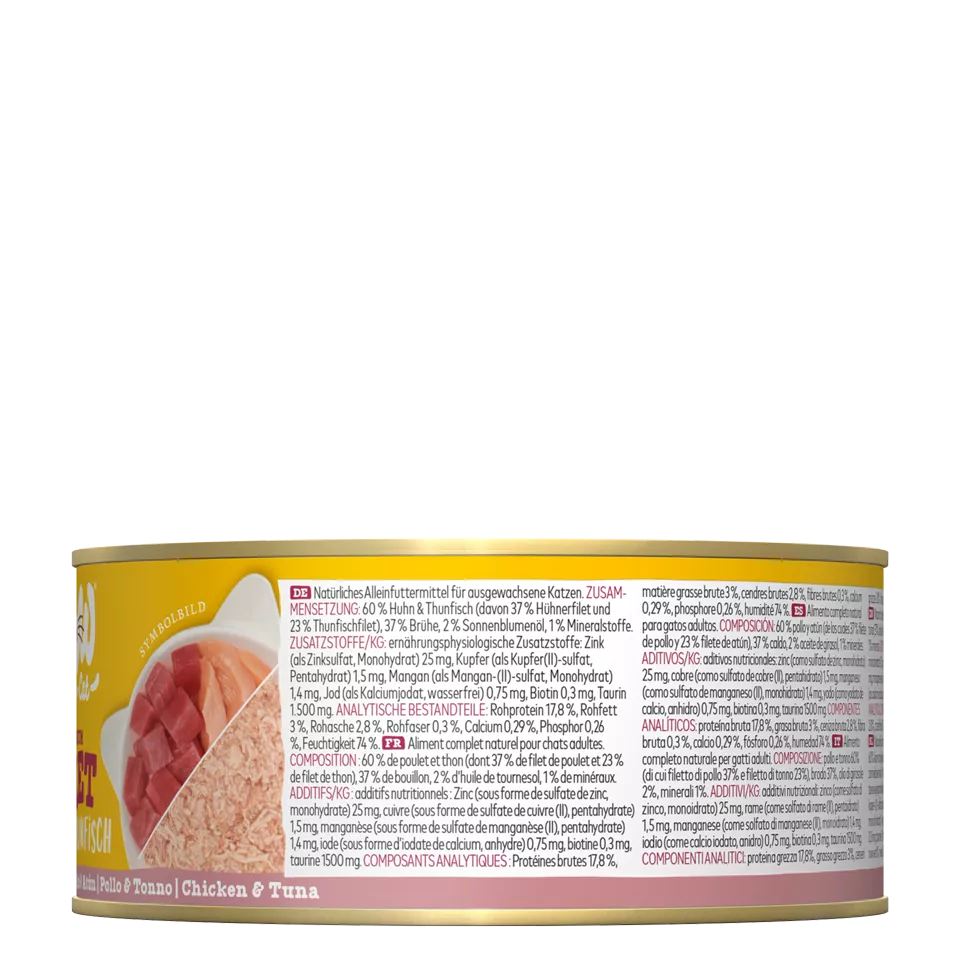Composición: 60 % pollo y atún (de los cuales 37 % filete de pollo y 23 % filete de atún), 37 % caldo, 2 % aceite de girasol, 1 % minerales.