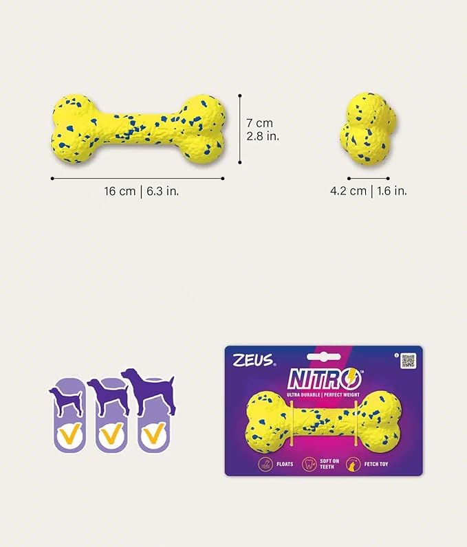 Si a tu perro le encanta nadar, se divertirá aún más cuando Zeus NITRO se una a la fiesta. Cada juguete NITRO flota perfectamente y cuenta con una variada combinación de formas que su perro puede morder fácilmente y llevar hasta la orilla.